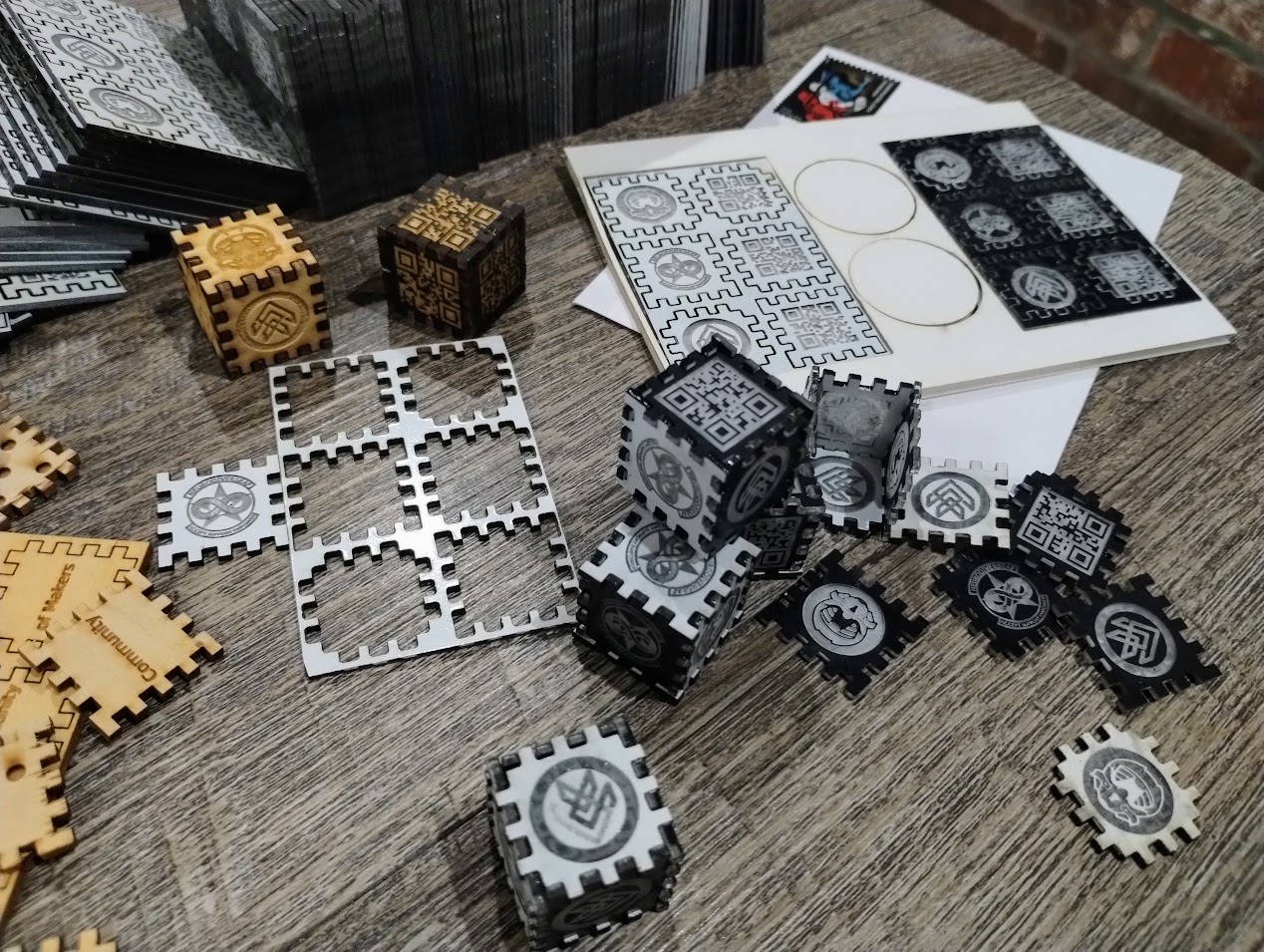 QR Cubes are 6-sided cubes that flat-pack into a wood-or-acrylic-cut business card. I custom make them using my home laser cutter. Each side has a logo of a website or community, and the flip of it has a QR Code that links to it. They're also just fun to build and play or fidget with, especially if you put something inside them that rattles! :)